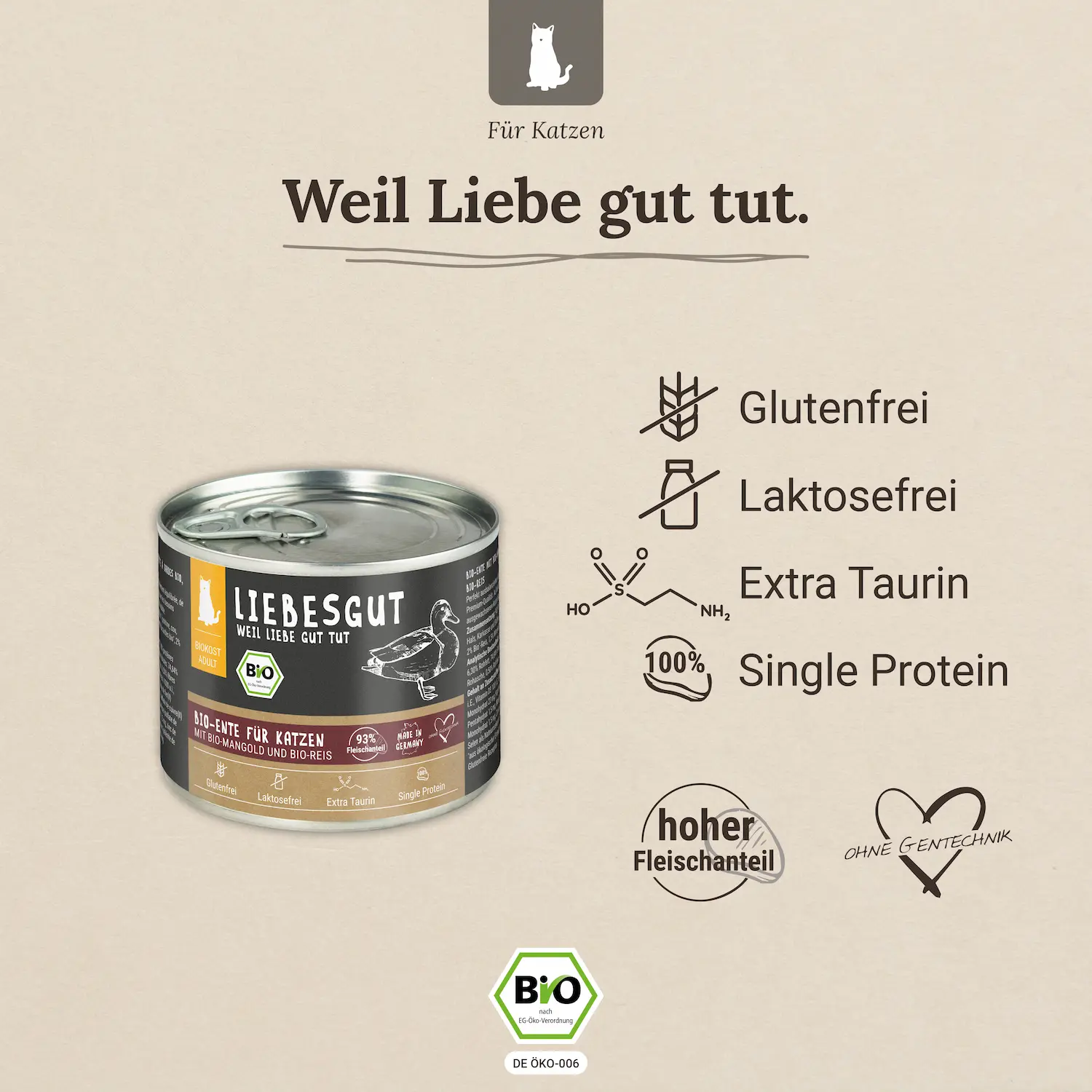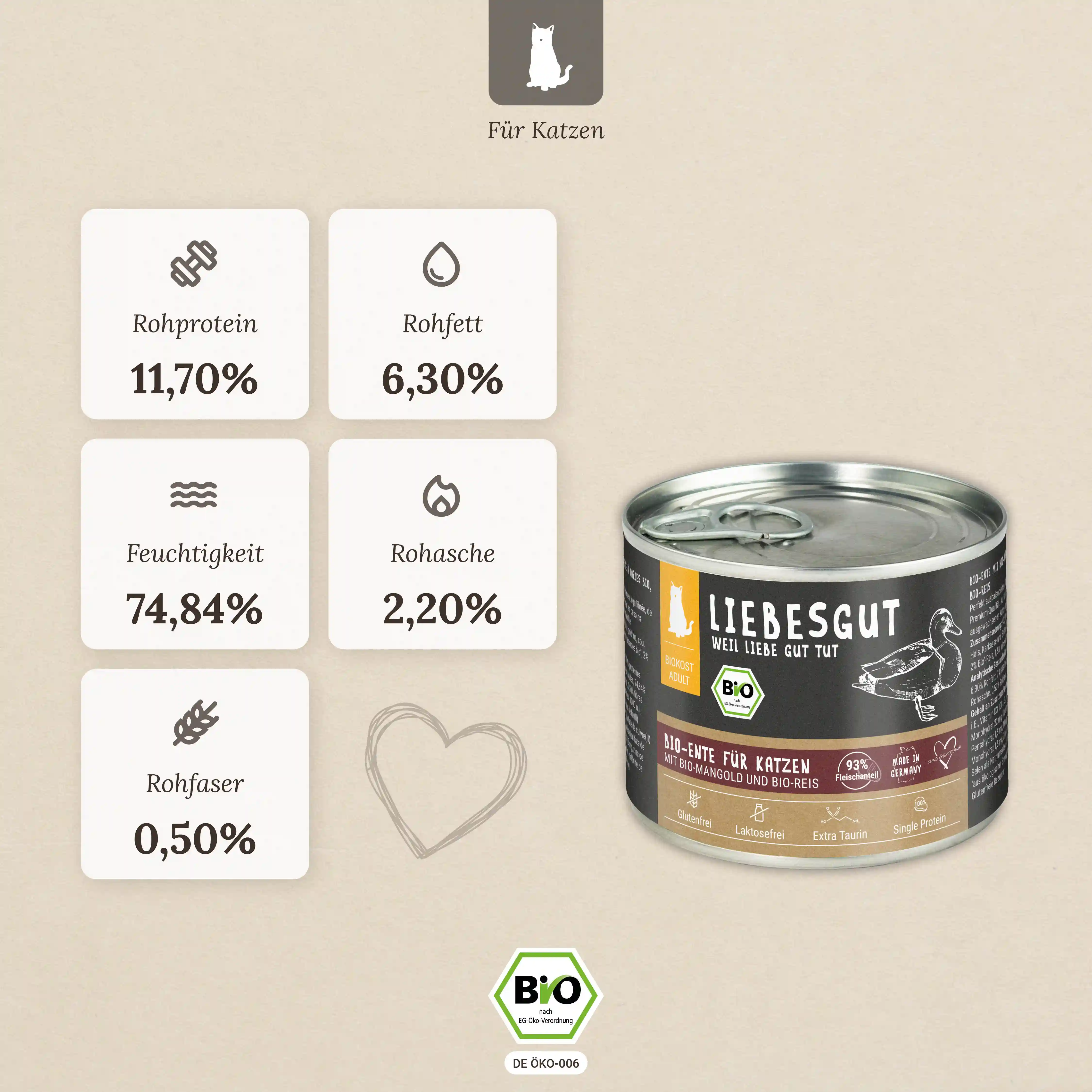 Unser Bio-Futter ist nicht nur reich an hochwertigen Zutaten, sondern auch glutenfrei und laktosefrei, was es auch für empfindliche Katzen leicht verträglich macht. Darüber hinaus enthält es nur eine reine Proteinquelle, was ideal für Katzen mit speziellen Ernährungsbedürfnissen ist.