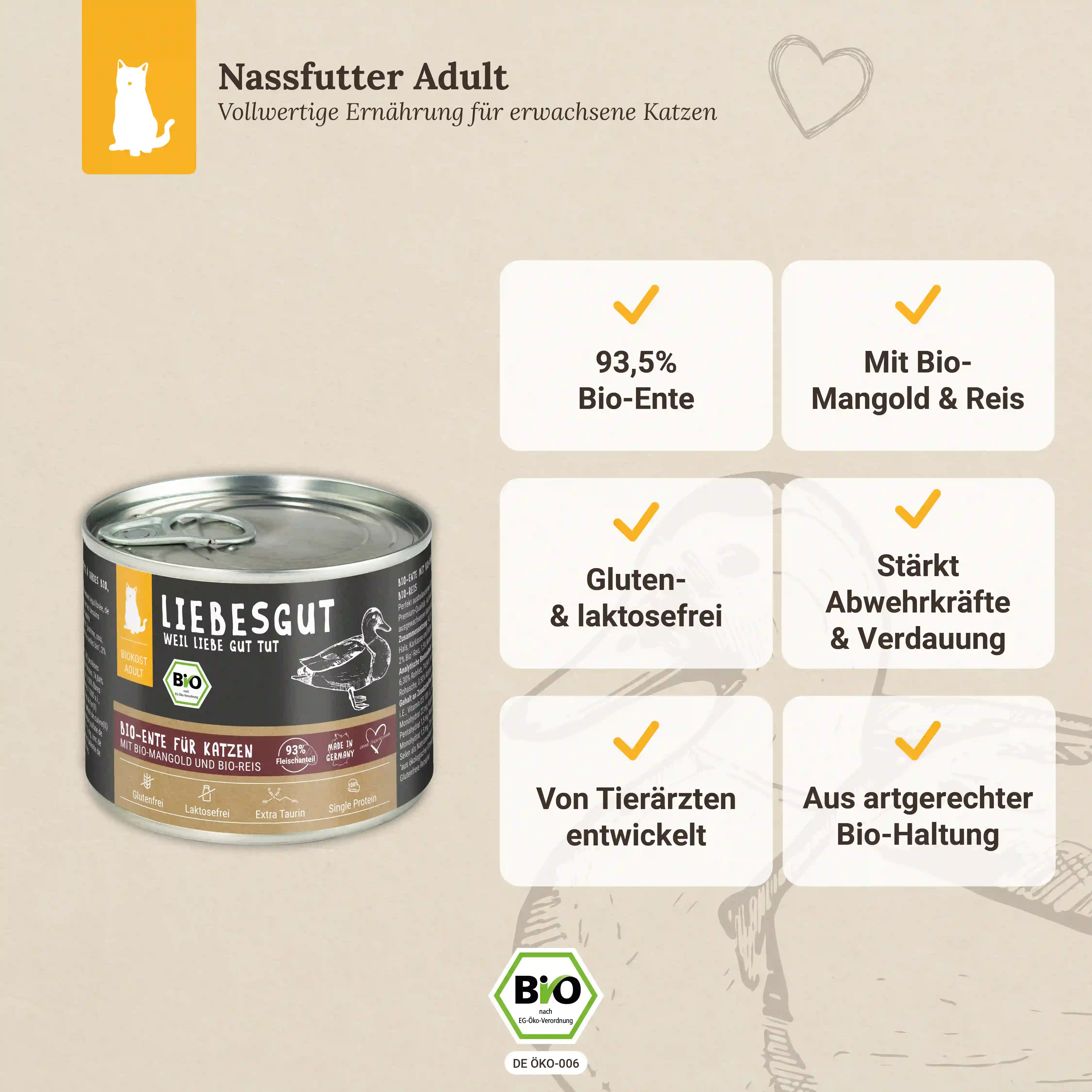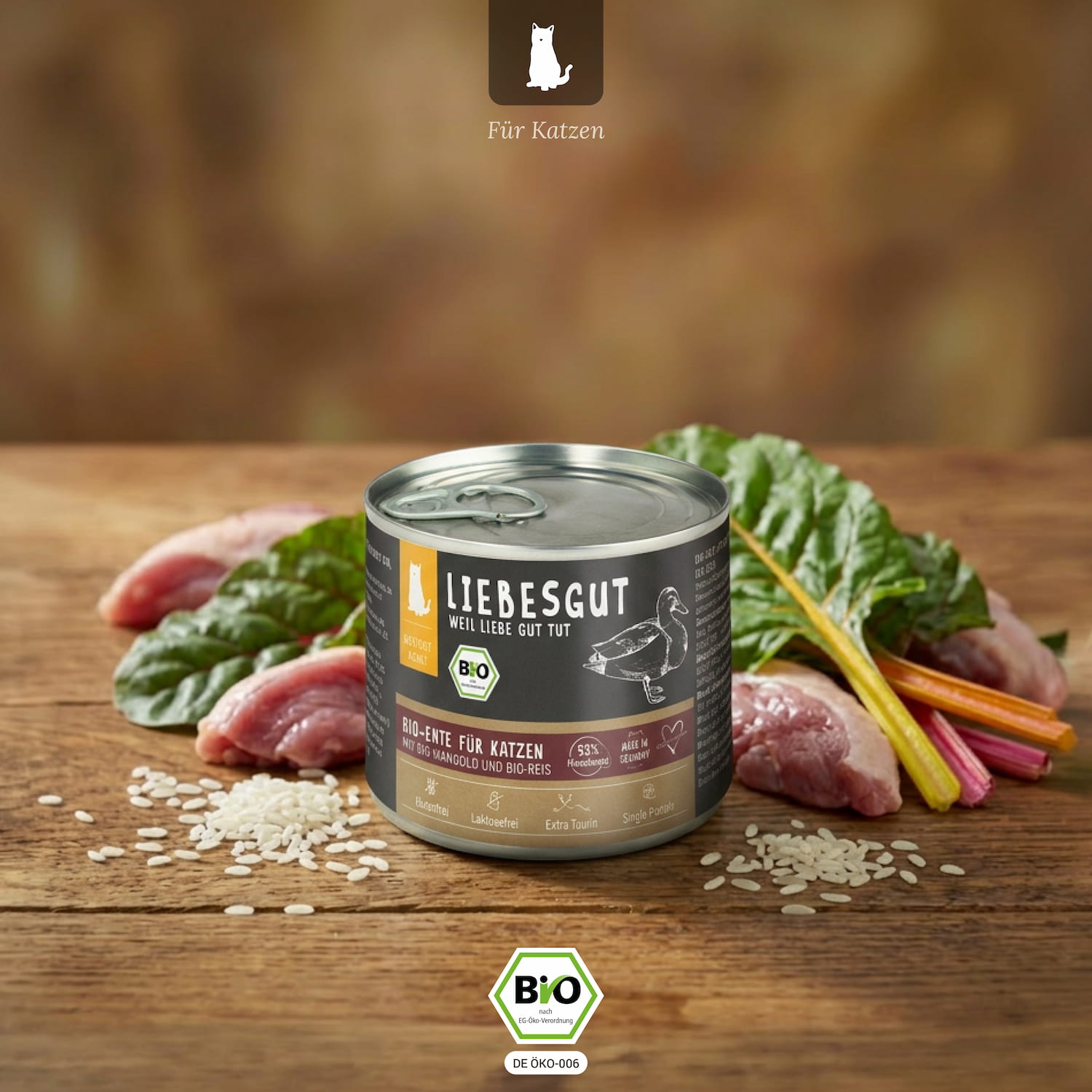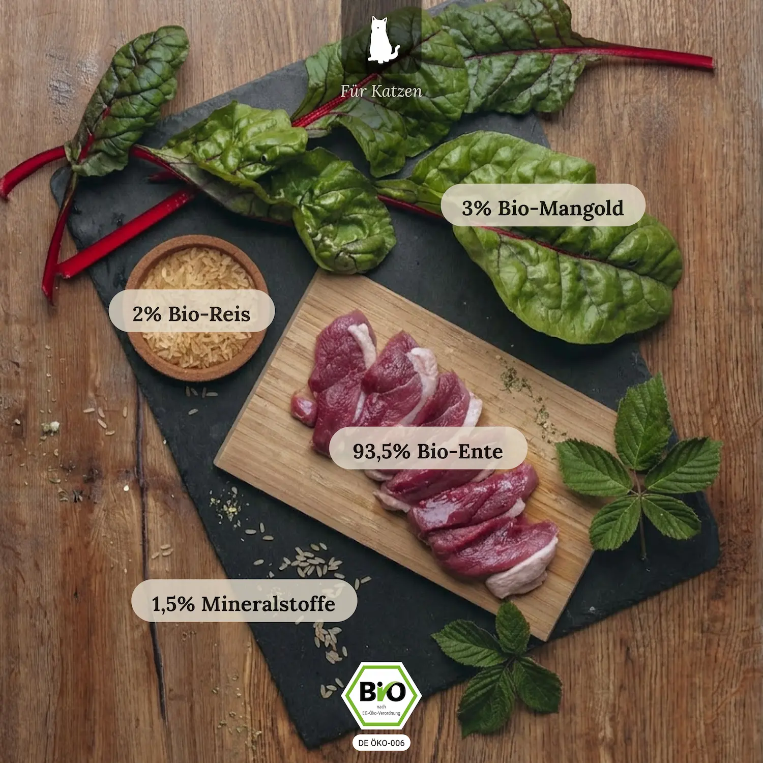 Unser Bio-Menü "Bio-Ente mit Bio-Mangold und Bio-Reis" bietet hochwertiges Eiweiß aus einer einzigen Proteinquelle sowie eine Vielzahl gesunder Zutaten. Neben frischem Muskelfleisch enthält es auch Hals und Karkasse (Brustkorb), die reich an Mineralstoffen und natürlichem Vitamin B sind. Das zarte Geflügelfleisch ist leicht verdaulich und verwöhnt den Gaumen Deiner Katze. Mangold ist eine hervorragende Quelle für Vitamine wie Vitamin C und K, unterstützt die Verdauung und versorgt Deine Katze mit wichtigen Mineralstoffen wie Kalzium, Magnesium und Eisen. Glutenfreie Reisflocken sorgen für eine optimale Verdaulichkeit und verleihen dem Futter eine angenehme Konsistenz.