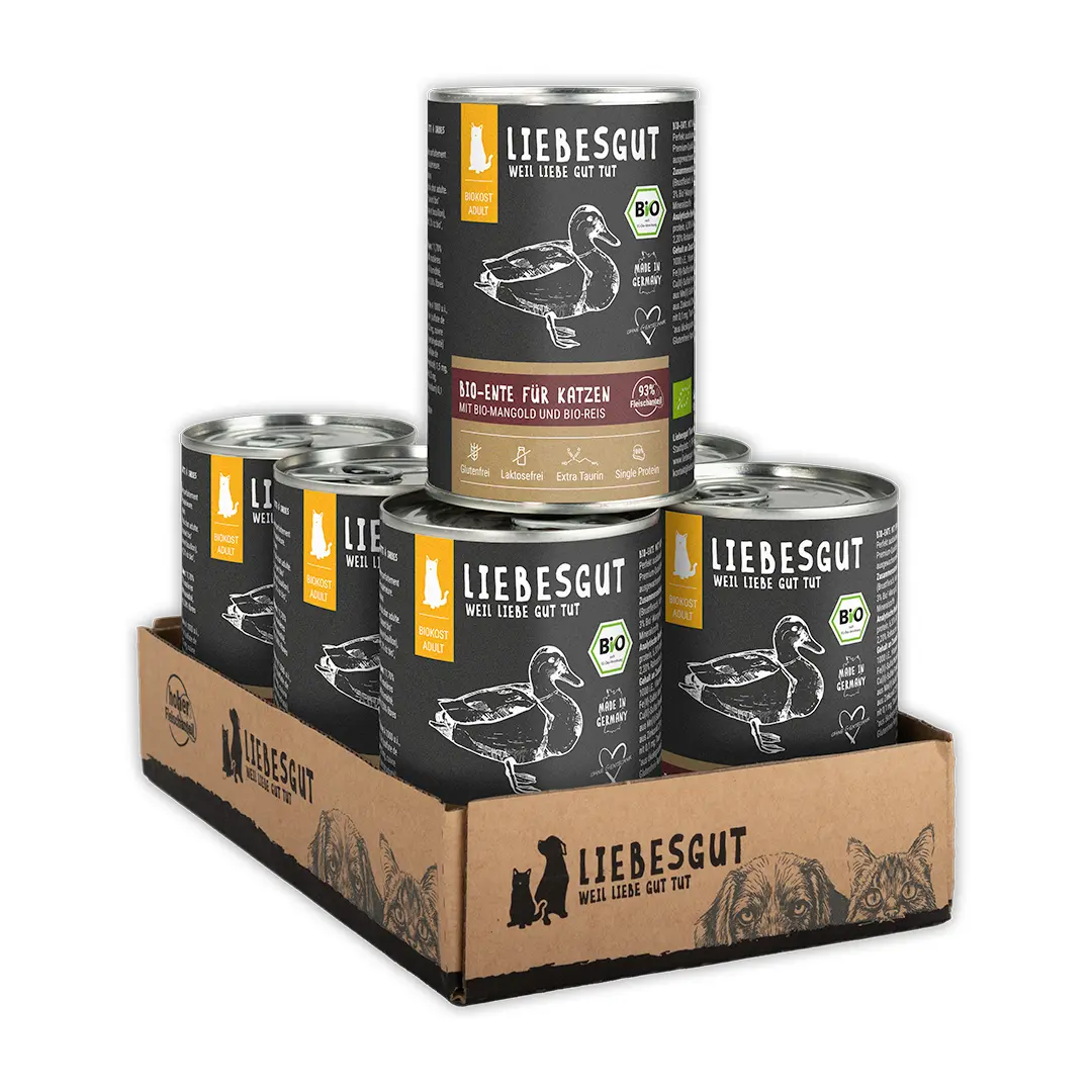 Unser Bio-Menü "Bio-Ente mit Bio-Mangold und Bio-Reis" bietet hochwertiges Eiweiß aus einer einzigen Proteinquelle sowie eine Vielzahl gesunder Zutaten. Neben frischem Muskelfleisch enthält es auch Hals und Karkasse (Brustkorb), die reich an Mineralstoffen und natürlichem Vitamin B sind. Das zarte Geflügelfleisch ist leicht verdaulich und verwöhnt den Gaumen Deiner Katze. Mangold ist eine hervorragende Quelle für Vitamine wie Vitamin C und K, unterstützt die Verdauung und versorgt Deine Katze mit wichtigen Mineralstoffen wie Kalzium, Magnesium und Eisen. Glutenfreie Reisflocken sorgen für eine optimale Verdaulichkeit und verleihen dem Futter eine angenehme Konsistenz.