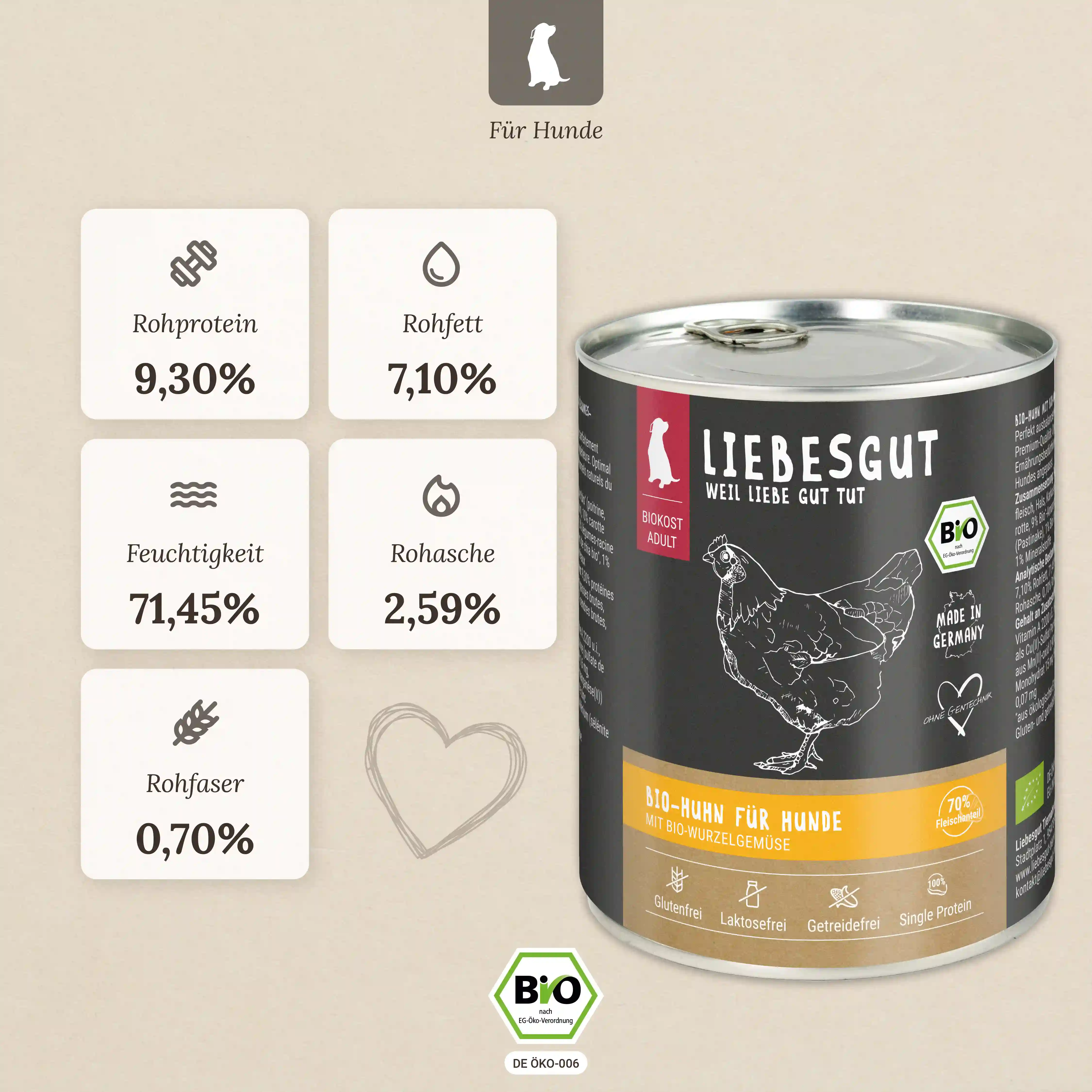 | Inhaltsstoffe: | 1% Bio-Chiasamen, 1% Bio-Leinöl , 1% Mineralstoffe, 8% Bio-Wurzelgemüse (Pastinake), 9% Bio-Amaranth, 10% Bio-Karotte, 70% Bio-Huhn (Brustfleisch, Hals, Karkasse und Brühe) |