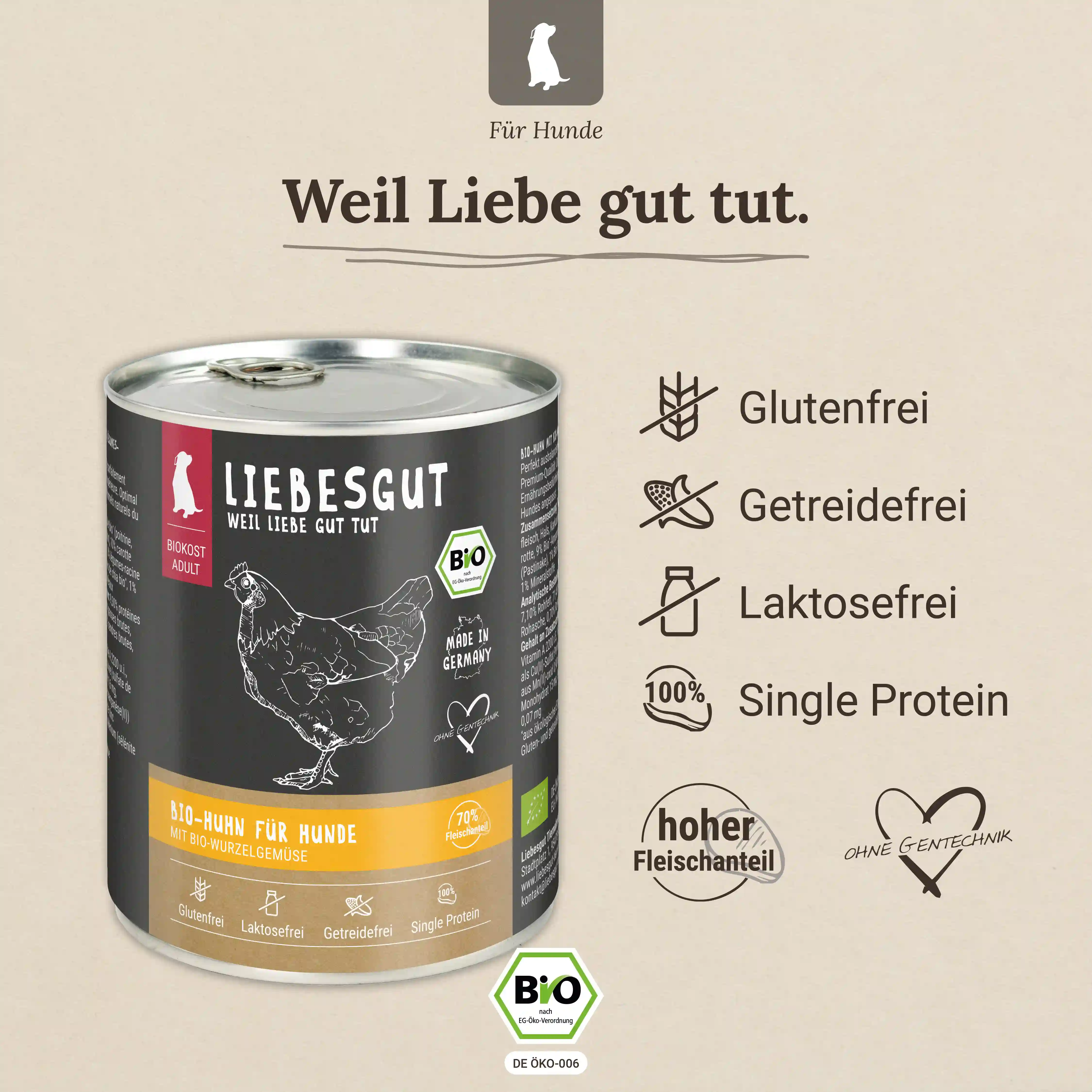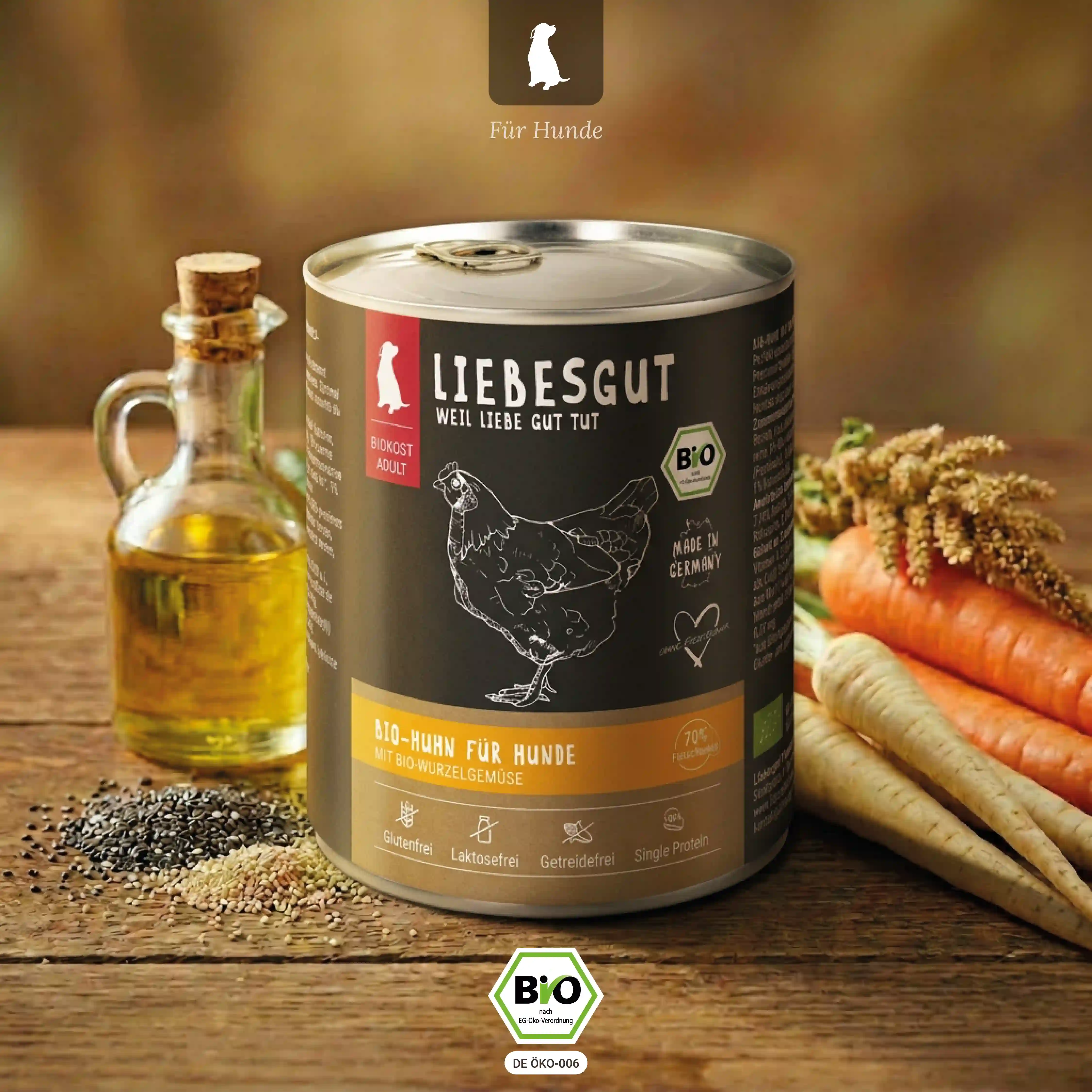 Unser Bio-Hundefutter Adult mit Bio-Huhn, Bio-Wurzelgemüse und Bio-Amaranth ist die ideale Wahl für die gesunde Ernährung Deines ausgewachsenen Hundes. Entwickelt von Tierärzten und Ernährungsspezialisten, bieten unsere naturreinen Bio-Rezepturen eine ausgewogene Kombination aus lebenswichtigen Nährstoffen, die genau auf die Bedürfnisse Deines erwachsenen Hundes abgestimmt sind.