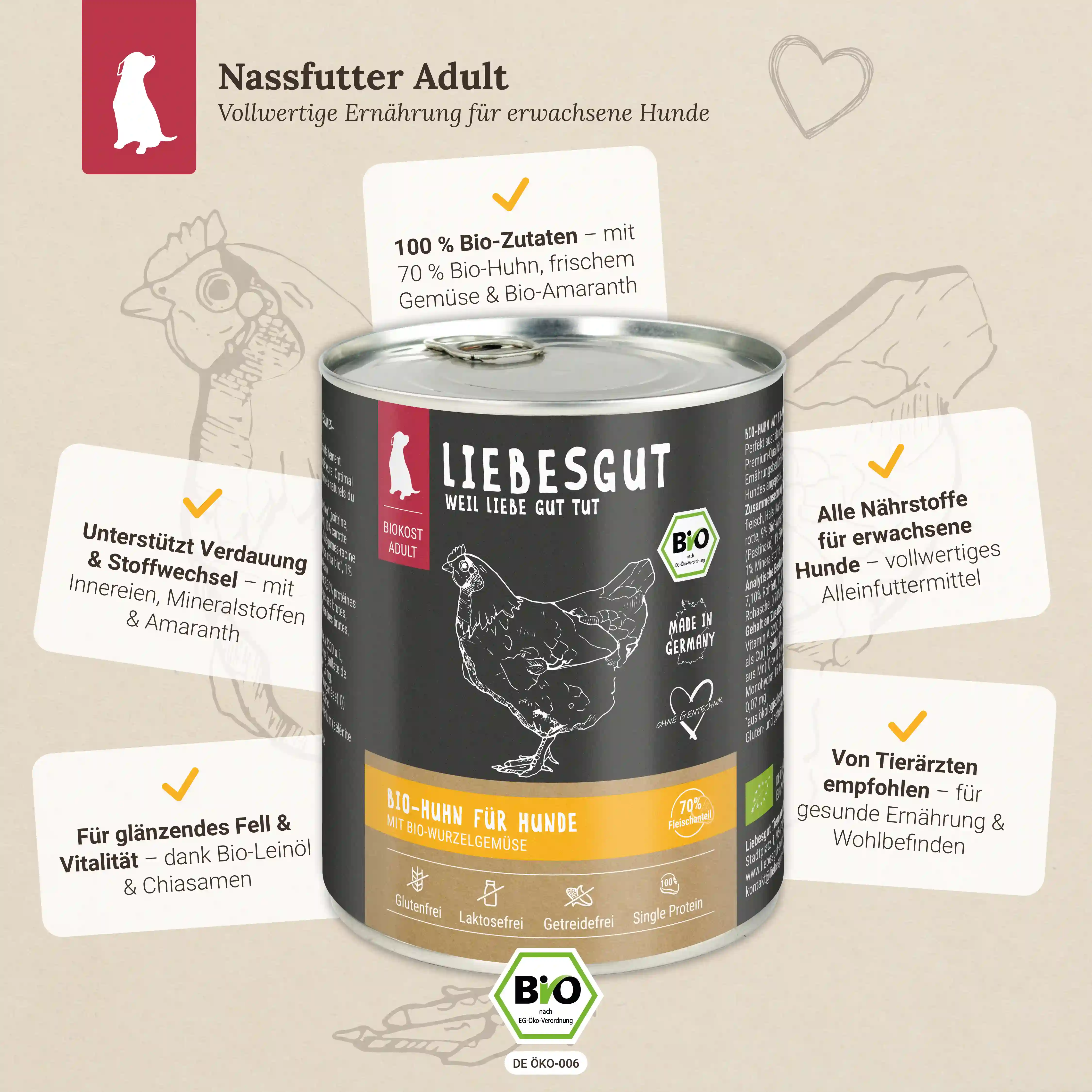 Vertraue auf die natürliche Kraft unseres Bio-Hundefutters Adult mit Bio-Huhn, Bio-Wurzelgemüse und Bio-Amaranth und gib Deinem ausgewachsenen Hund die bestmögliche Nahrung für ein glückliches und gesundes Leben.