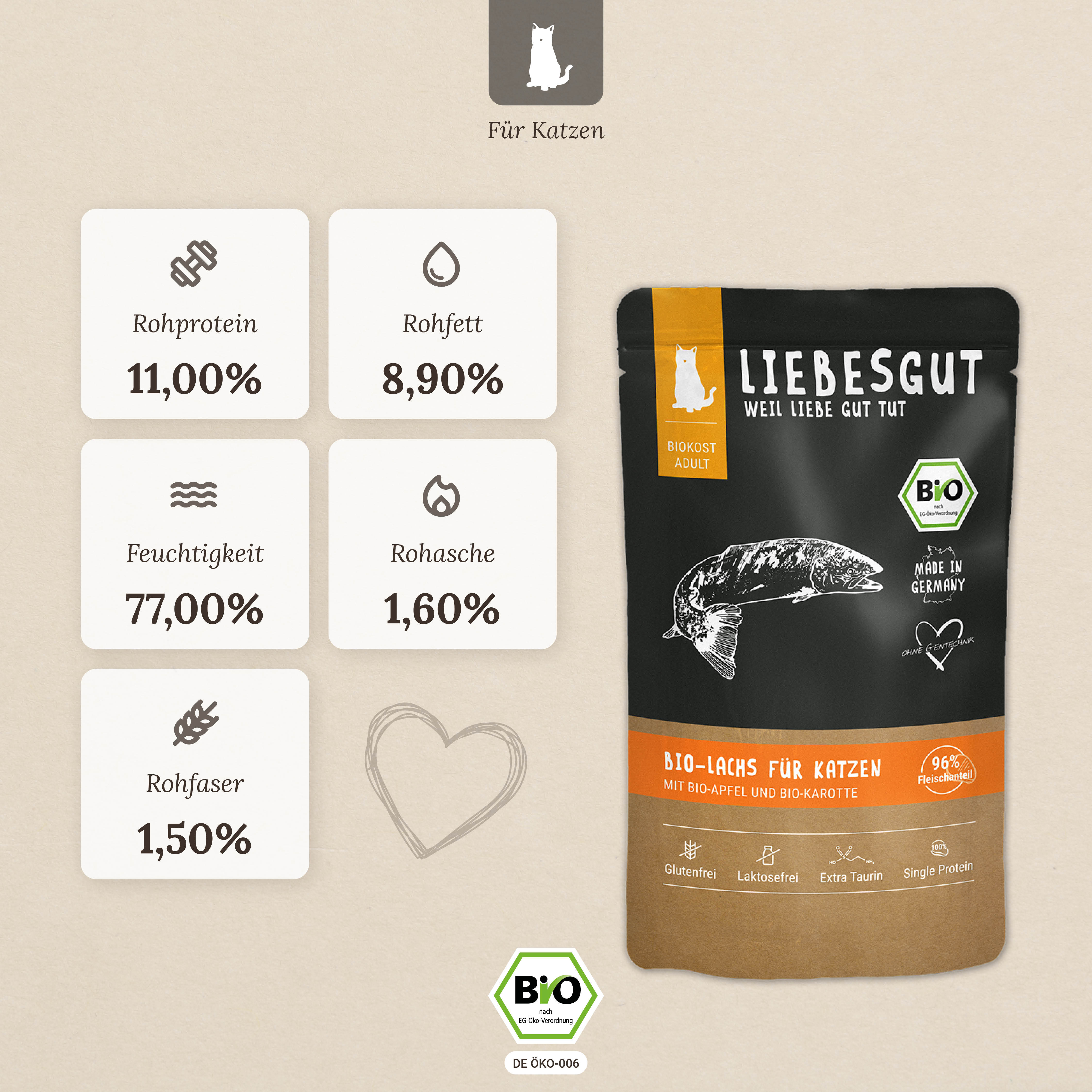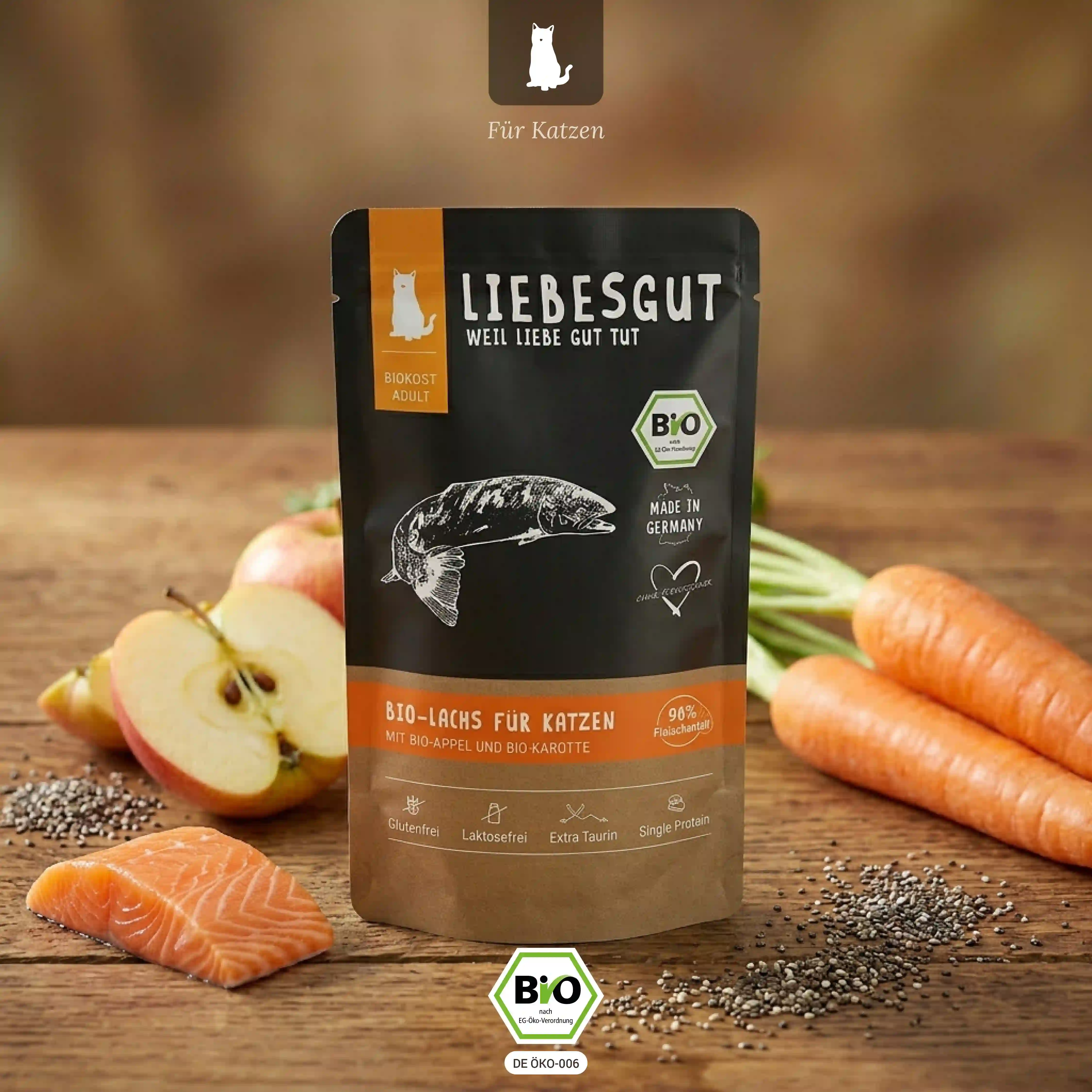 | Inhaltsstoffe: | 0,7% Bio-Chiasamen, 1% Mineralstoffe, 1,4% Bio-Apfel, 1,4% Bio-Karotte, 95,5% Bio-Lachs |