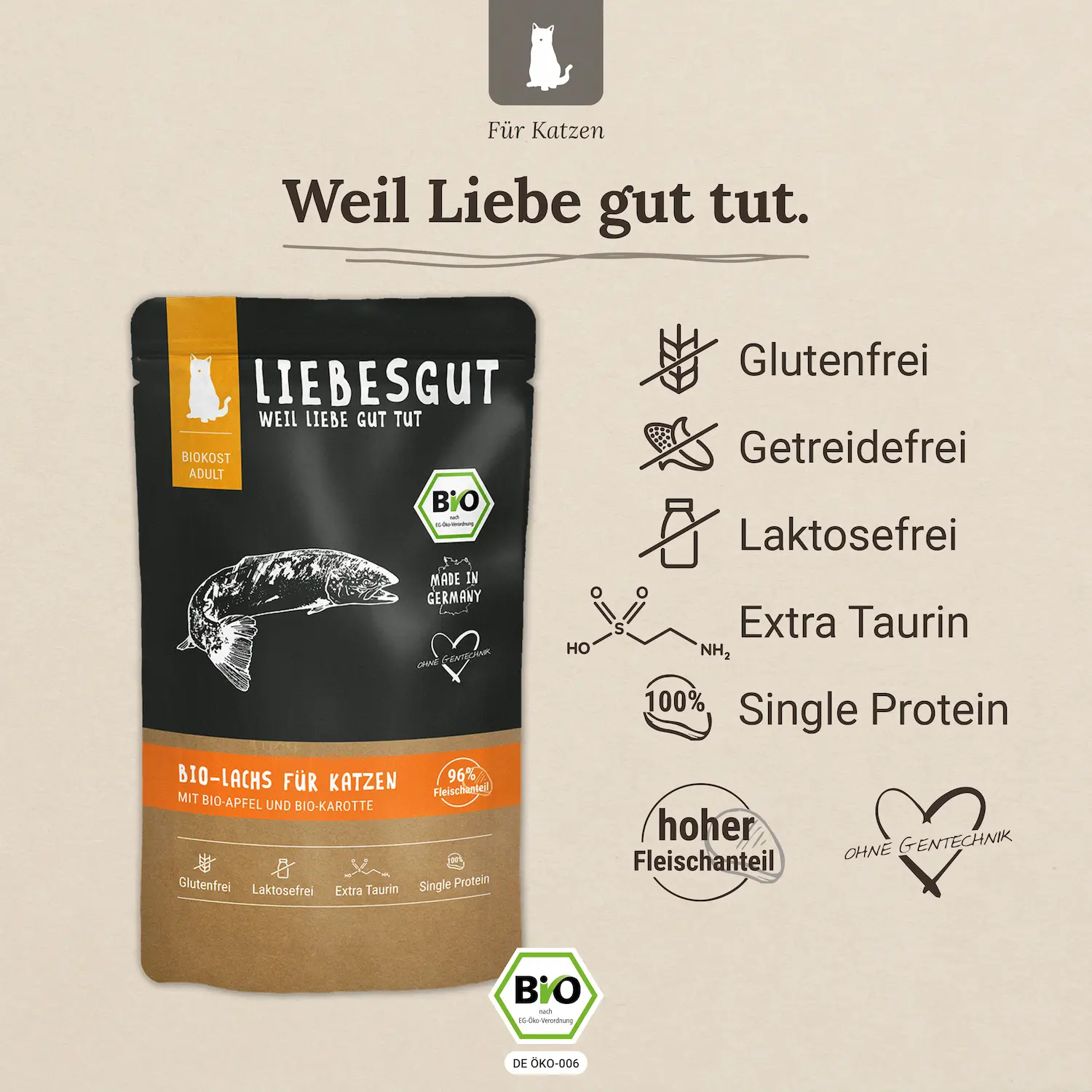 Unser getreidefreies, glutenfreies, laktosefreies und Bio-Alleinfutter ist perfekt auf die Bedürfnisse ausgewachsener Katzen abgestimmt. Entwickelt von Tierärzten und Ernährungsspezialisten, bieten unsere naturreinen Bio-Rezepturen alle lebenswichtigen Nährstoffe, die Deine Katze für ein gesundes und langes Leben benötigt. Neben frischem Single-Protein-Muskelfleisch sorgen auch tiergesunde Innereien sowie eine Vielzahl frischer Gemüse-, Obst- und Kräutersorten für eine ausgewogene Ernährung. Hochwertige Öle runden das Futter ab und unterstützen den Fettsäurehaushalt Deiner Katze.