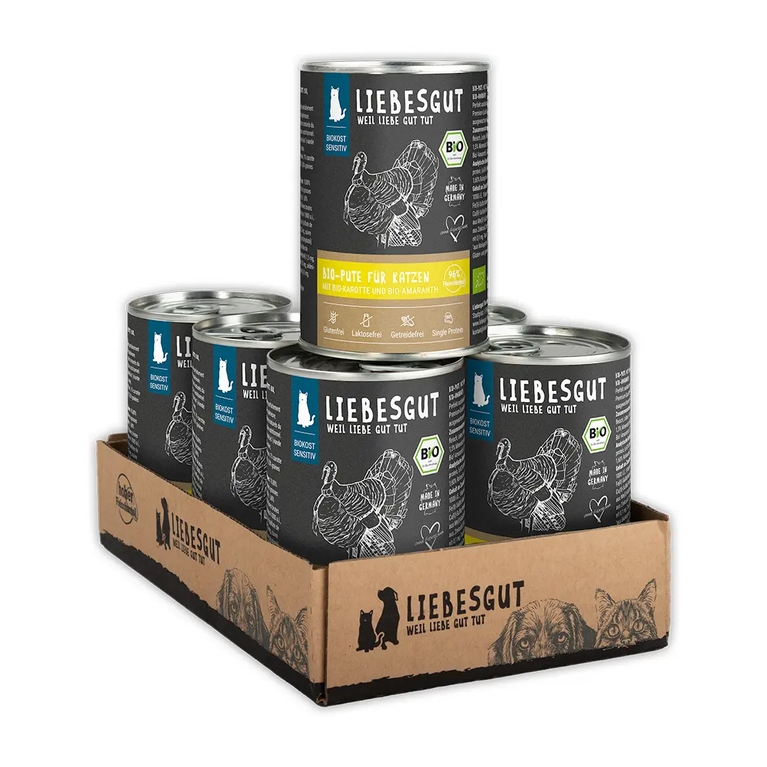 Unser Liebesgut Bio-Katzenfutter Sensitiv mit Bio-Pute, Bio-Karotte & Bio-Amaranth ist ein wahrer Genuss für deinen pelzigen Gefährten. Mit einem beeindruckenden Fleischanteil von 96% aus bester Bio-Pute von Bauernhöfen in Oberbayern wird die Muskelbildung und -erhaltung unterstützt.