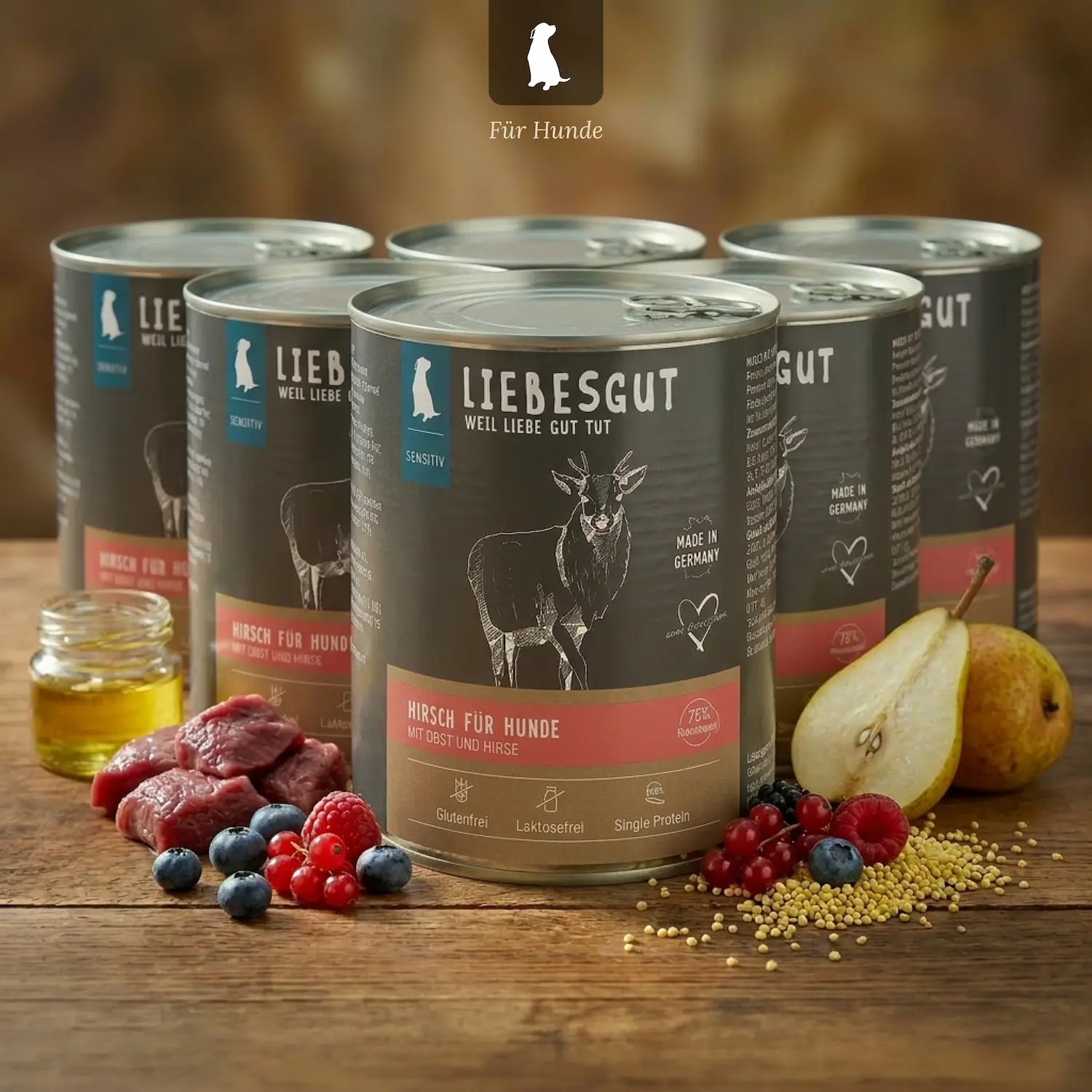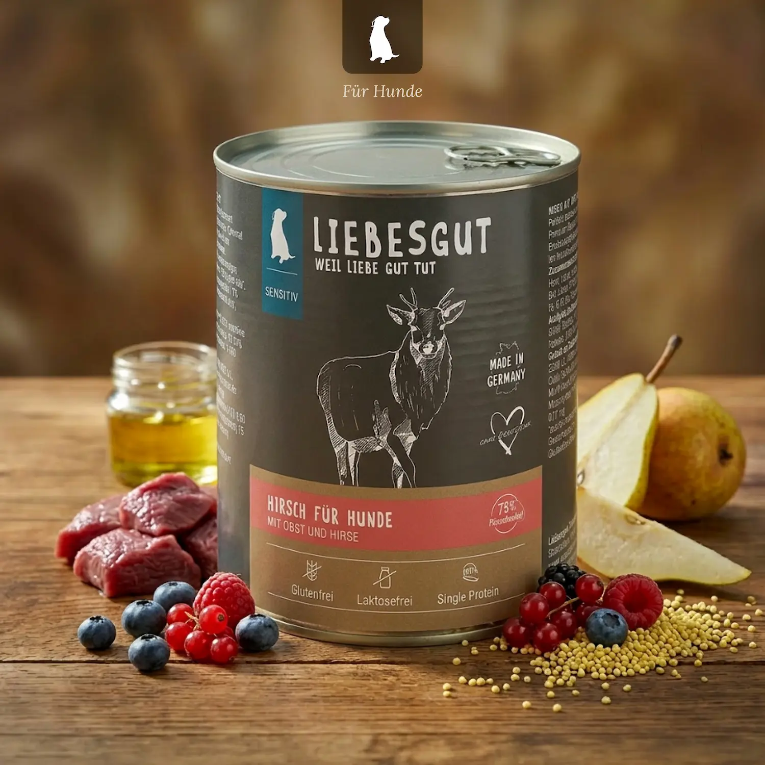 Unser "Hirsch mit Bio-Obst und Bio-Hirse" ist nicht nur ein Genuss für Deinen Liebling, sondern auch ein wahrer Gaumenschmaus für ernährungssensible Hunde. Mit hochwertigem Hirschfleisch als Single-Protein-Quelle, das für seine hohe Verträglichkeit bekannt ist, ist dieses Menü die perfekte Wahl für Allergiker und feinschmeckende Vierbeiner.