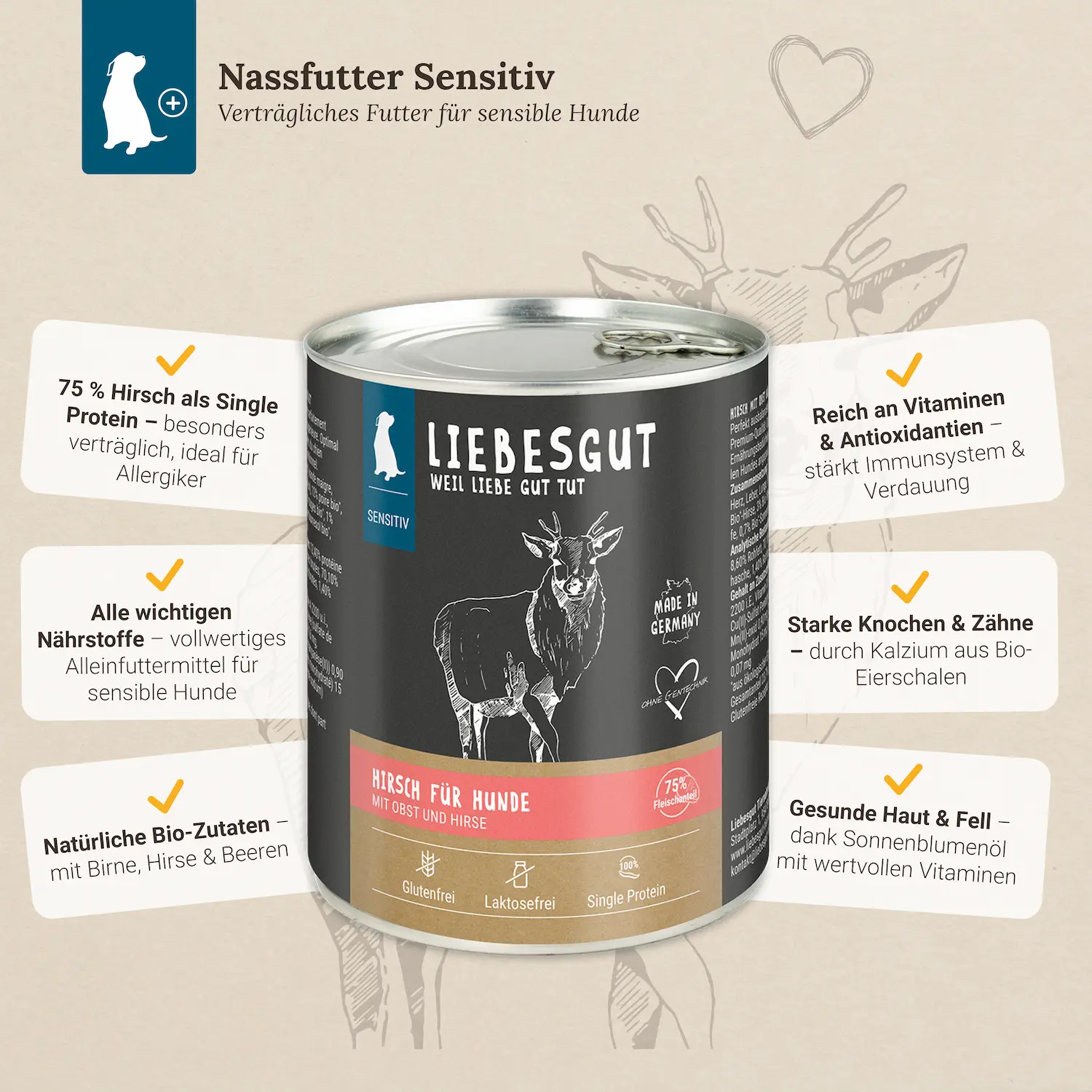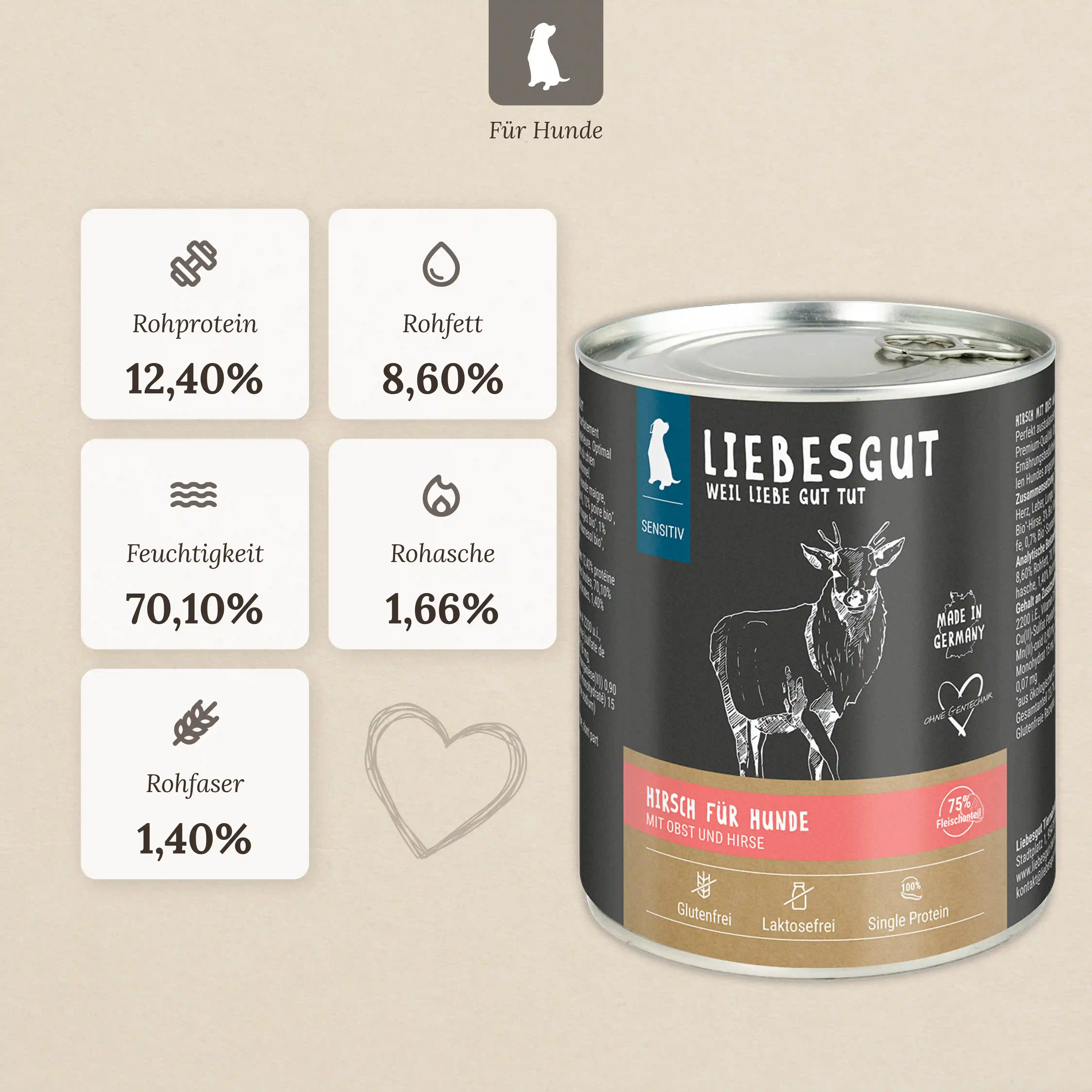 Ob Dein Hund ernährungssensibel ist, an Allergien leidet oder besondere Bedürfnisse hat - unser "Hirsch mit Bio-Obst und Bio-Hirse" ist die richtige Wahl. Es eignet sich sogar für Diäten und bei bestimmten Krankheiten wie Nieren- oder Leberproblemen.