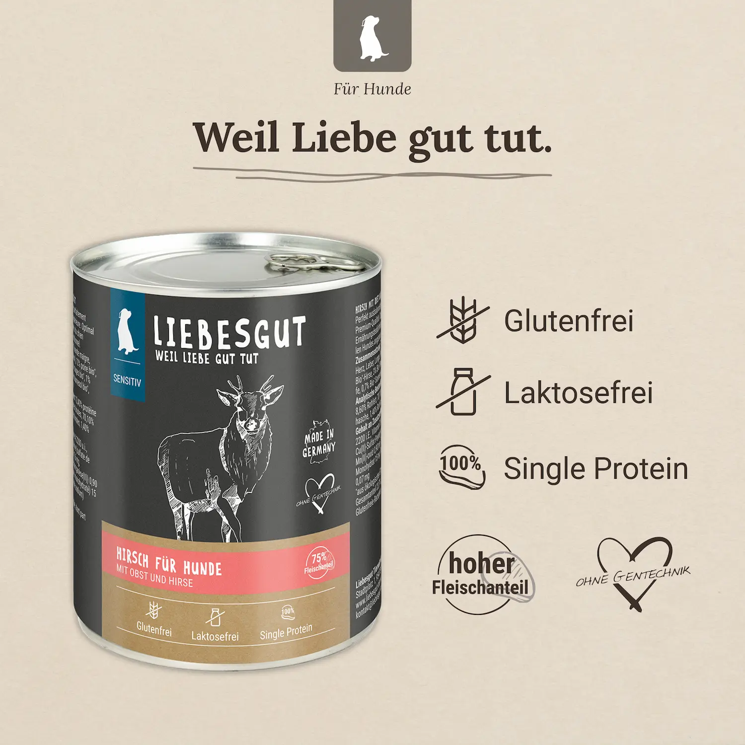 - 75 % Hirsch als Single Protein – besonders verträglich, ideal für Allergiker