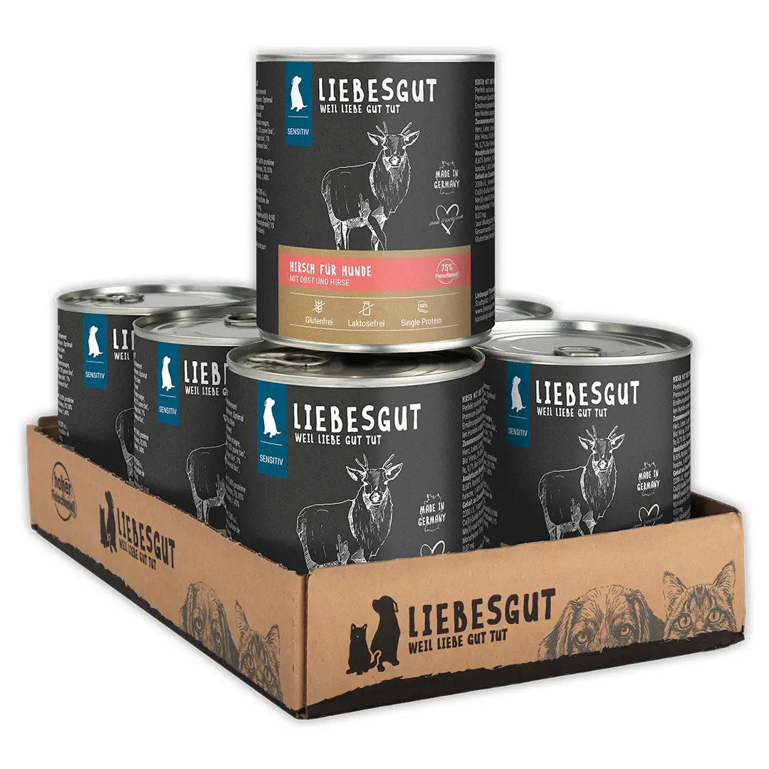 Ob Dein Hund ernährungssensibel ist, an Allergien leidet oder besondere Bedürfnisse hat - unser "Hirsch mit Bio-Obst und Bio-Hirse" ist die richtige Wahl. Es eignet sich sogar für Diäten und bei bestimmten Krankheiten wie Nieren- oder Leberproblemen.