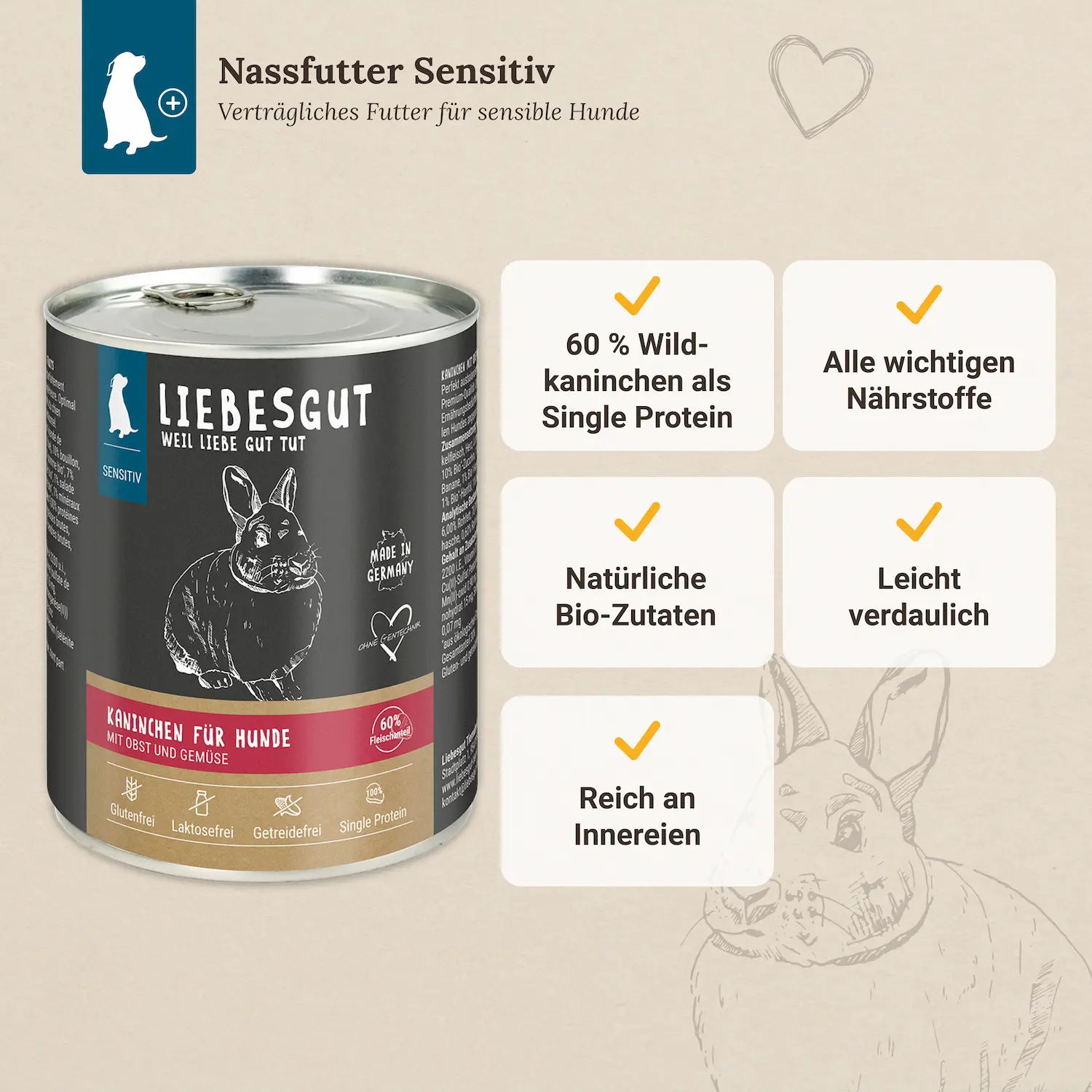 - 60 % Wildkaninchen als Single Protein – besonders verträglich für sensible Hunde & Allergiker