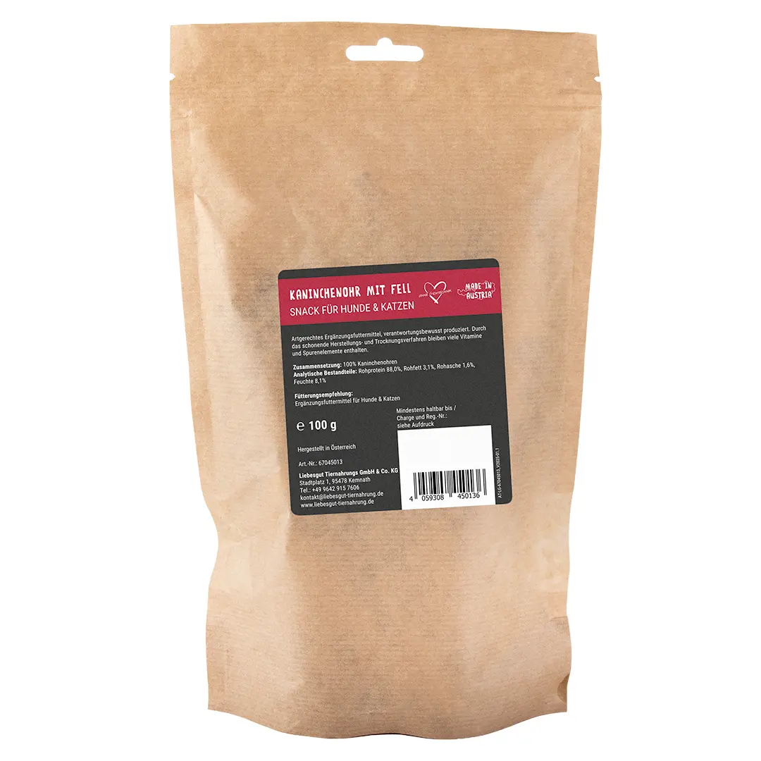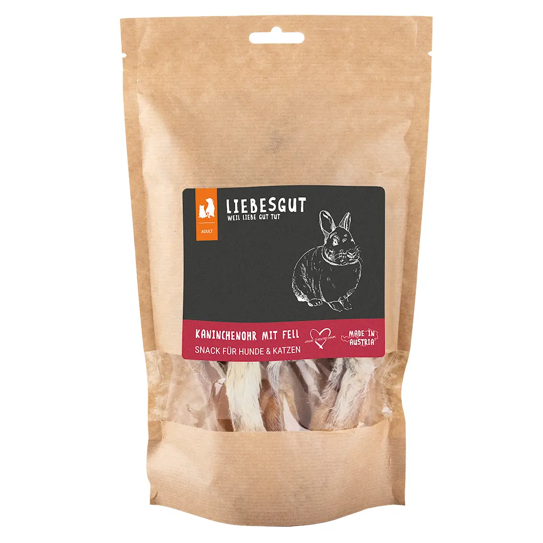 Mit den Liebesgut Kaninchen-Ohren mit Fell, verpackt in einem praktischen, wiederverschließbaren Flachbodenbeutel, bietest Du Deinem treuen Begleiter nicht nur einen schmackhaften Snack, sondern unterstützt auch seine Gesundheit und sein Wohlbefinden auf natürliche Weise – ein reines Naturprodukt für das Wohl Deines Hundes.