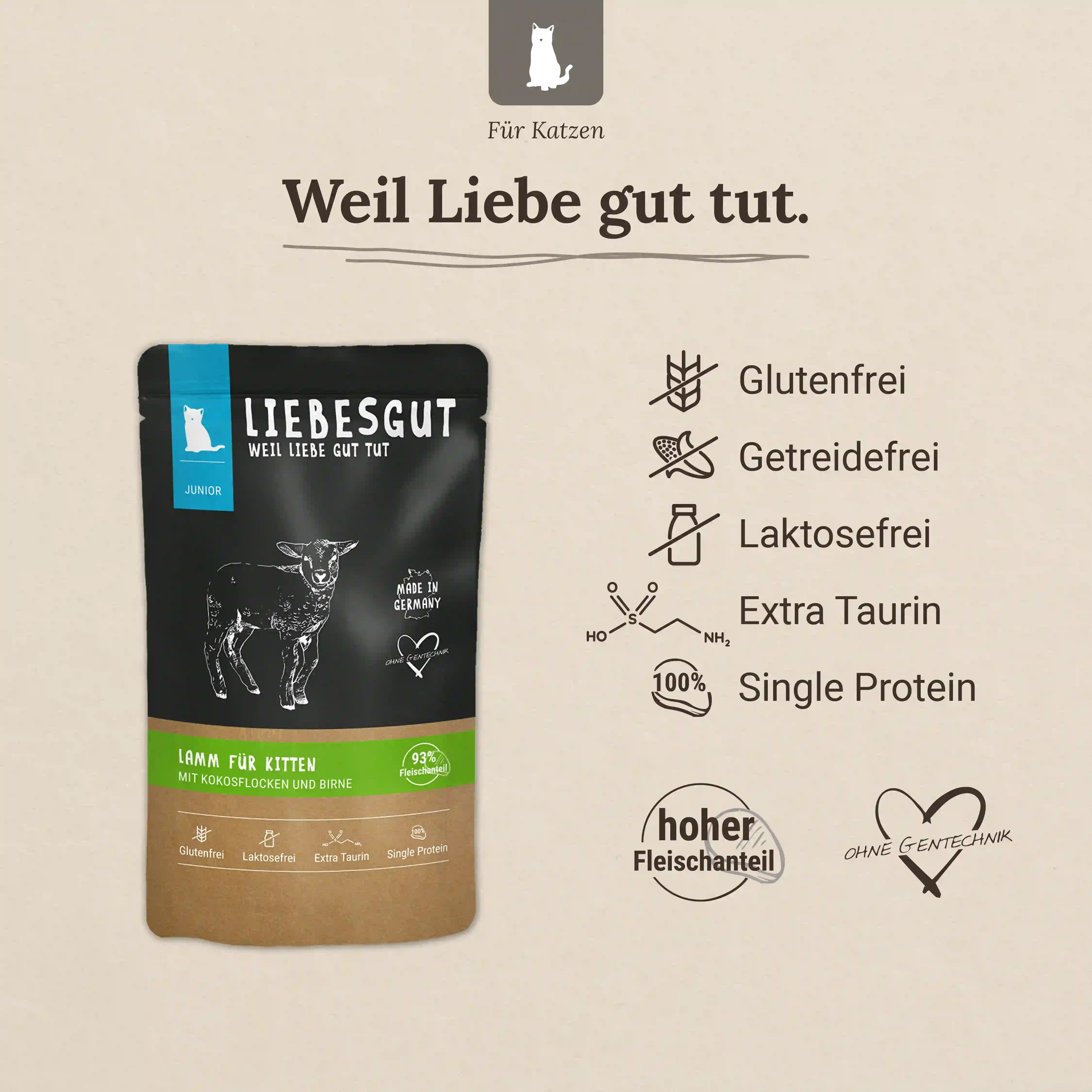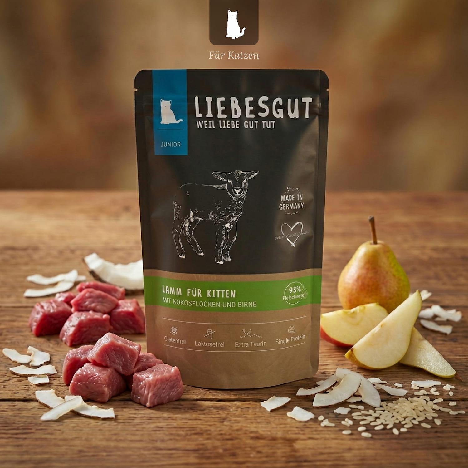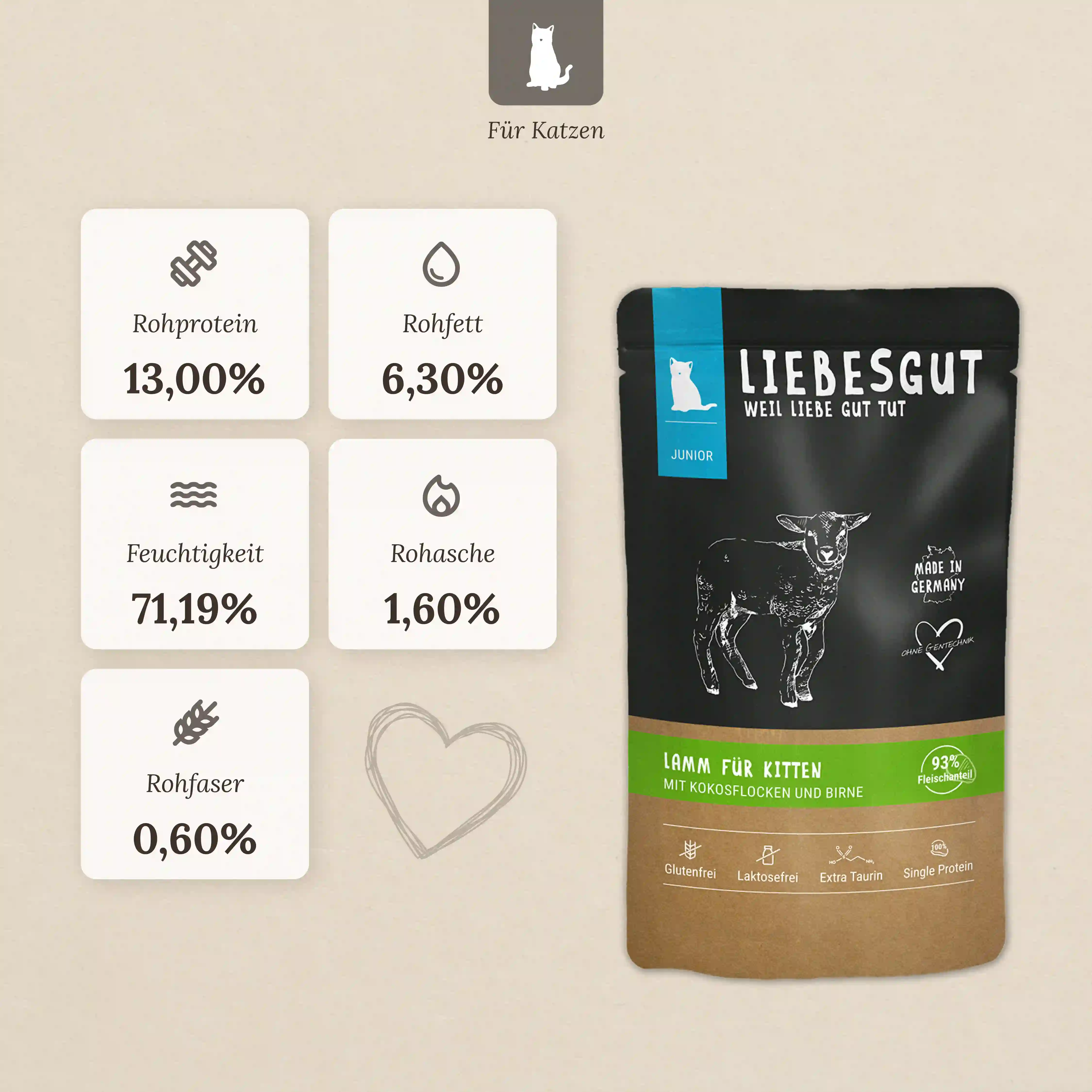 Unser Lamm-Menü ist eine magere und gut verträgliche Proteinquelle, ideal für junge Katzen und sogar für Allergiker. Das Lammfleisch ist reich an Eisen, Zink und B-Vitaminen, die für das Wachstum und die Entwicklung unerlässlich sind. Zusätzlich enthalten unsere Rezepturen Kokosflocken mit wertvollen mittelkettigen und mehrfach ungesättigten Fettsäuren für eine gesunde Haut und ein glänzendes Fell.