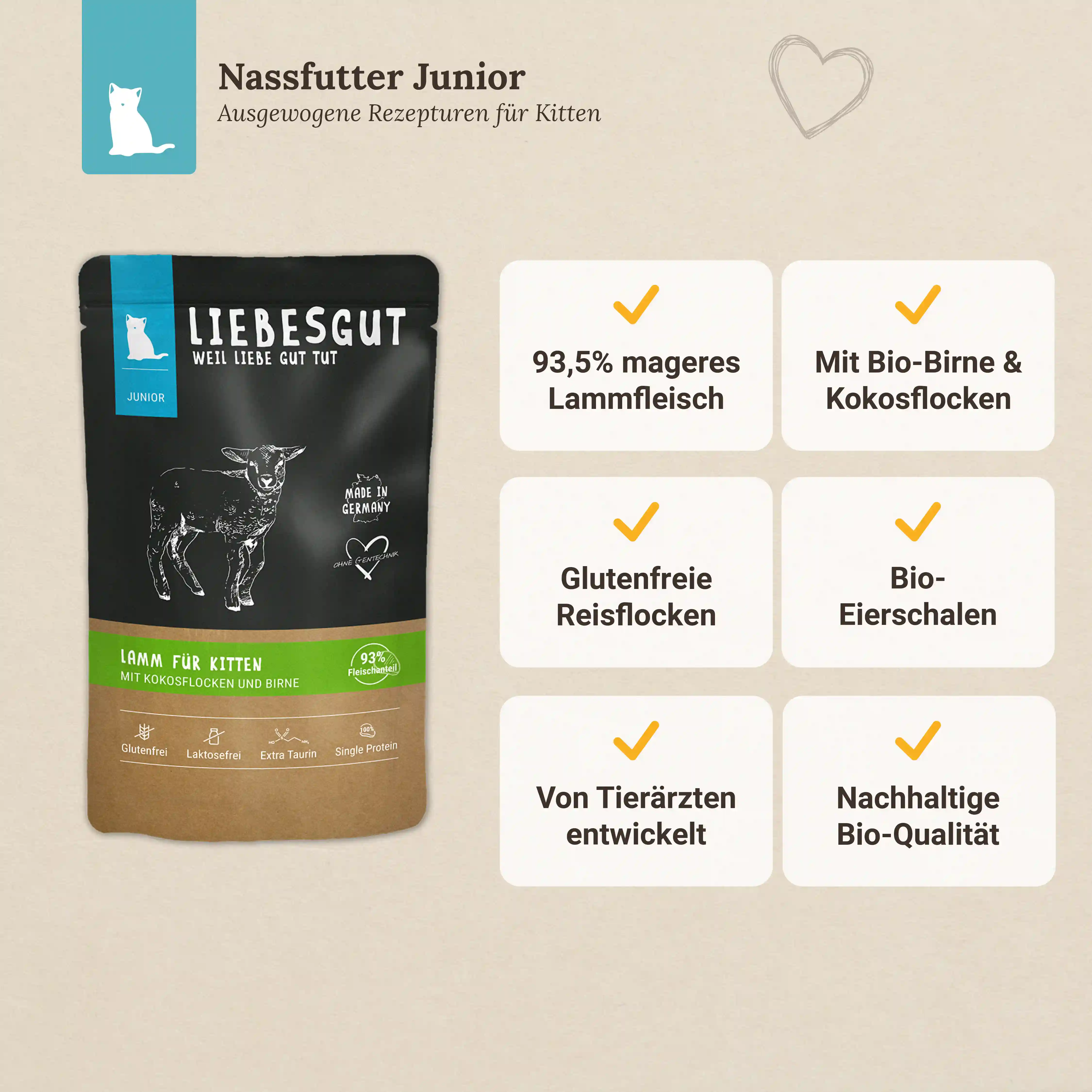 Produkteigenschaft: Artgerechte Tierhaltung, Bio, Extra Taurin, Frei von Antibiotika , Frei von Farb- und Konservierungsstoffen , Frei von synthetischen Lockstoffen, Getreidefrei, Glutenfrei, Hoher Fleischanteil, Keine Tierversuche, Laktosefrei, Nachhaltige Herstellung, Single Protein, Weizenfrei, Zuckerfrei, angepasst auf die Bedürfnisse im Alter