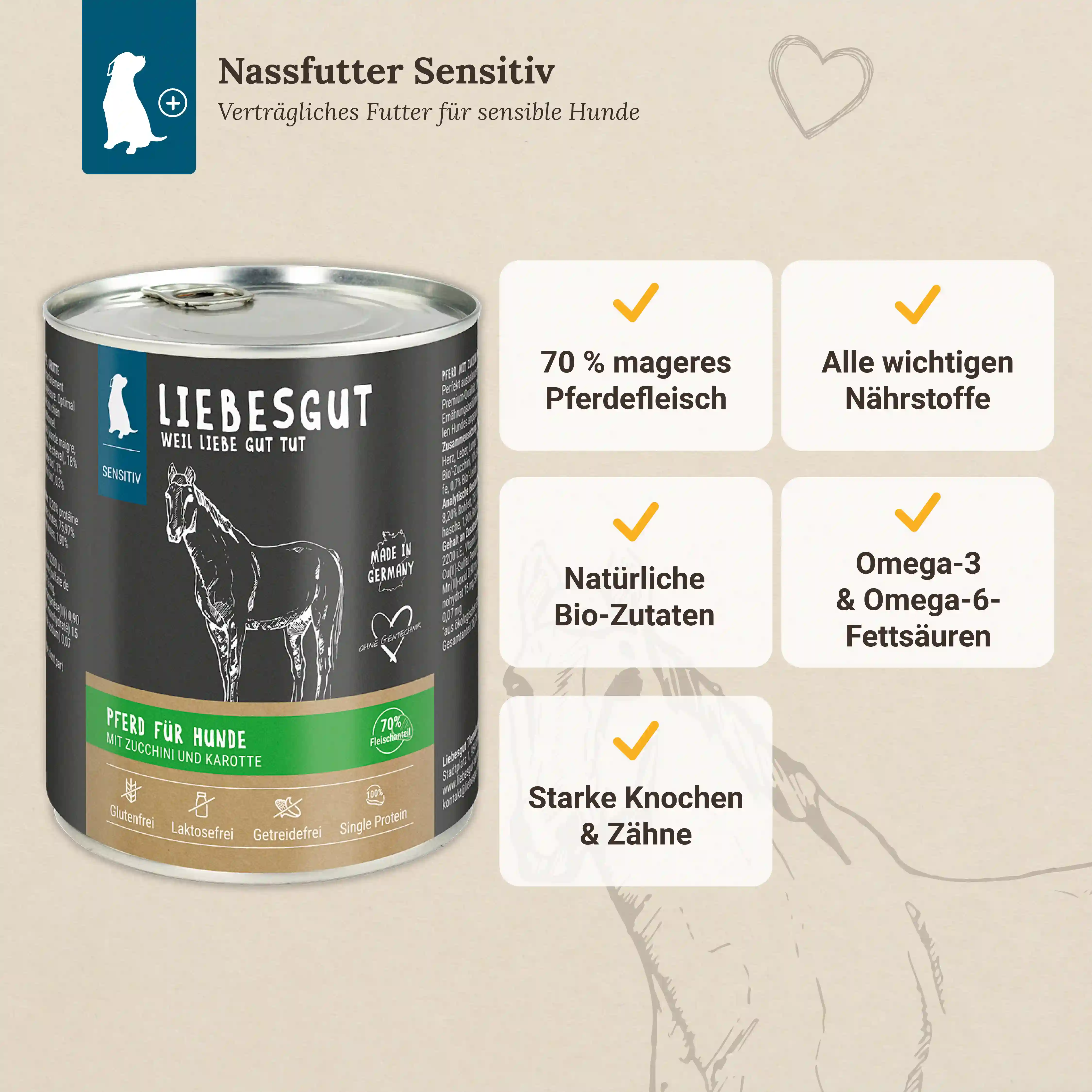Unser Sensitiv-Menü "Pferd mit Bio-Zucchini und Bio-Karotte" eignet sich besonders gut für ernährungssensible Hunde und Allergiker. Es ist sogar für eine Ausschlussdiät geeignet, falls Dein Hund spezielle Bedürfnisse hat.
