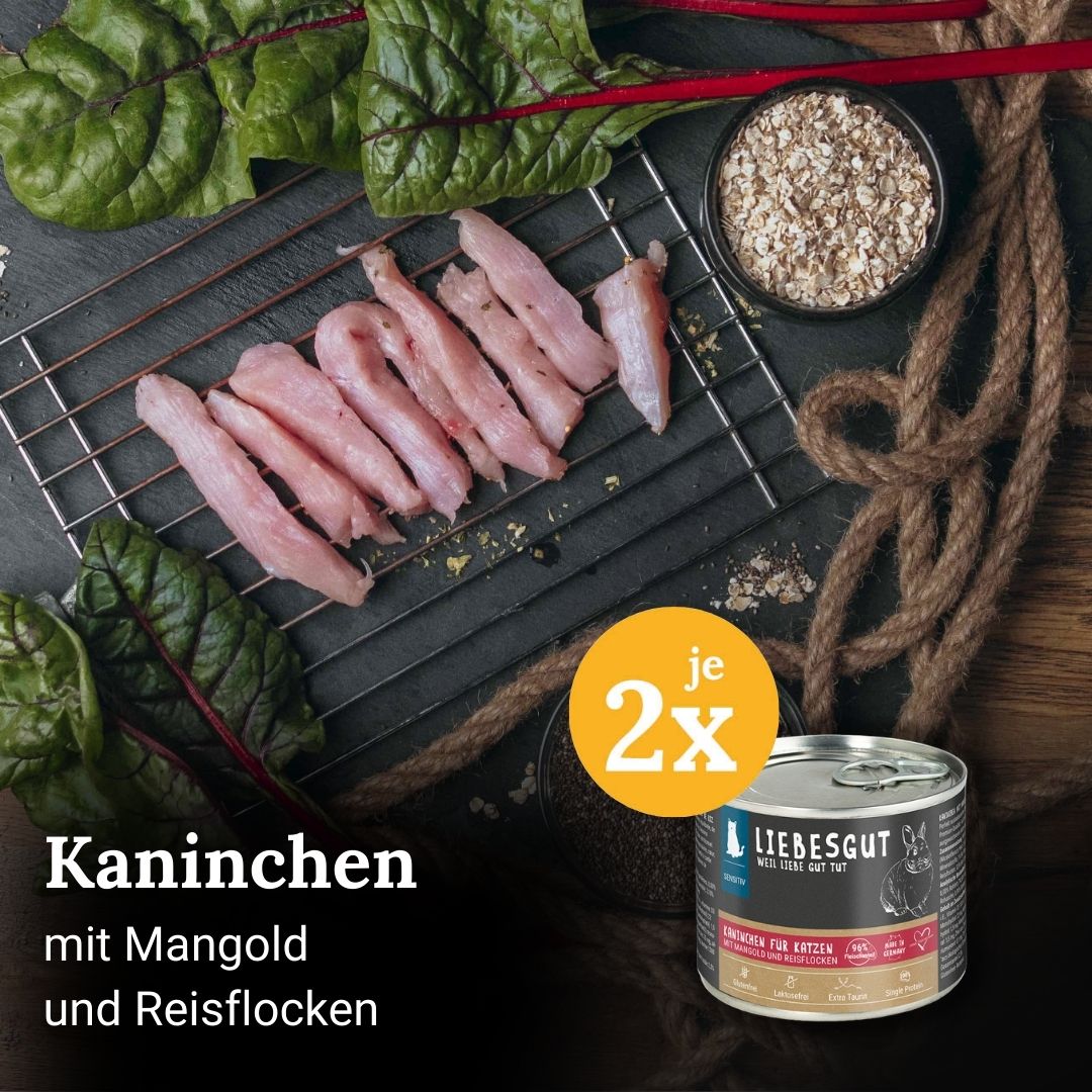 - Kannichen mit Mangold und Reisflocken: 96% Kaninchen (Muskelfleisch, Herz, Lunge, Leber), 1,5% Mineralstoffe, 1% Mangold*, 1% Reisflocken*, 0,5% Chiasaat*