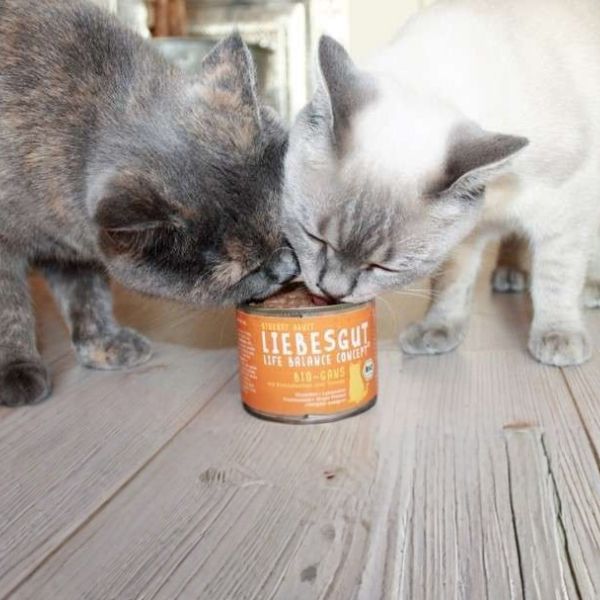 Seit einiger Zeit testen wir das Futter von Liebesgut. Unsere Mama ist ganz begeistert davon, aber auch wir schlemmen es gerne bis aufs letzte Detail vom Teller. Es hat eine sehr cremige Konsistenz, die wir total lieben. Da wir uns viel bewegen und sehr aktiv sind, haben wir oft nach dem Spielen das Bedürfnis, zu fressen. Da das Liebesgut-Futter einen sehr hohen Fleischanteil besitzt, brauchen wir nur kleine Portionen, um satt zu werden. Aber um ehrlich zu sein, schmeckt es mir so gut, dass ich manchmal für Nala mitesse. Durch den hohen Feuchtigkeitsgehalt im Futter brauchen wir auch kaum etwas zu trinken. Wir werden nur mit Nassfutter gefüttert. Am liebsten fressen wir Gans mit Kokos und Tomate und etwas Reis, welchen uns unsere Katzenmama untermischt. Seitdem wir das neue Futter testen, sieht unser Fell super aus und ist zudem seidig glatt. Wir lieben unser Liebesgut-Futter und unsere Mama ist sehr glücklich, weil wir gesund fressen.
